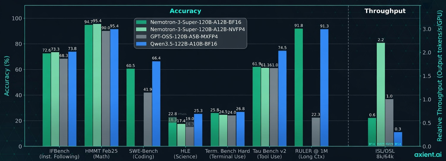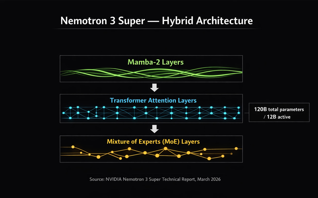 Nemotron 3 Super addresses this with a hybrid mixture-of-experts (MoE) architecture. Despite having 120 billion total parameters, only 12 billion are active at any moment — the model routes each token to a relevant subset of specialist modules rather than running the full parameter set every time. The result is over 5x throughput improvement versus the previous Nemotron Super, while maintaining accuracy on complex tasks.