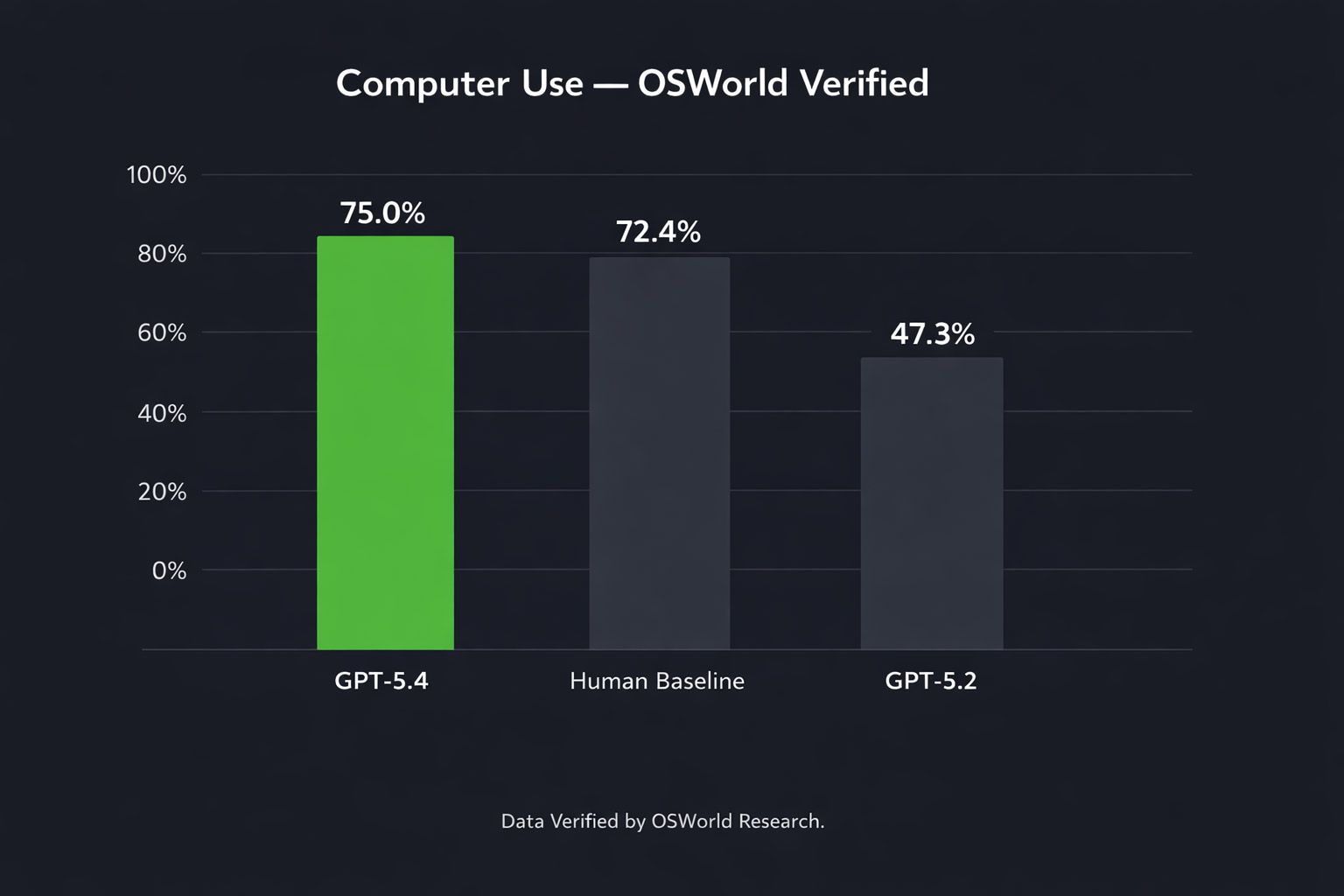 The benchmark numbers are striking. On OSWorld-Verified, which measures a model’s ability to navigate a desktop environment, GPT-5.4 achieves a 75.0% success rate — compared to 47.3% for GPT-5.2. Crucially, it also surpasses the human performance baseline of 72.4% on this benchmark.