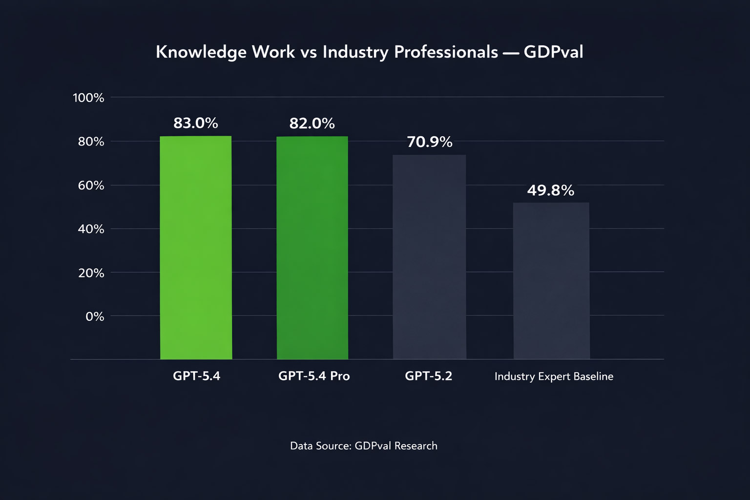 GPT-5.4 matches or exceeds industry professionals in 83.0% of comparisons. GPT-5.2 sat at 70.9%. That’s a meaningful jump — and GPT-5.4 Pro reaches 82.0%, with the standard model slightly ahead on this benchmark.